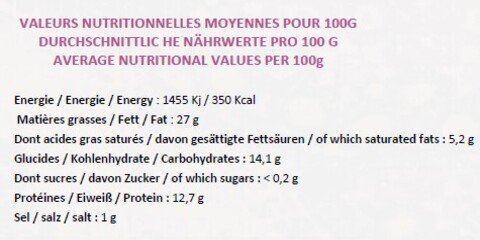 Noix de cajou crue BIO*, eau filtrée, sel non raffiné/non traité, échalote*, ciboulette*, ail*, ferments lactiques.