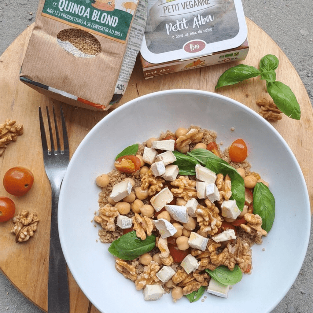 Une salade rapide et facile à préparer. Très complète avec des légumes, des légumineuses, des protéines, des noix, et notre Petit Alba.